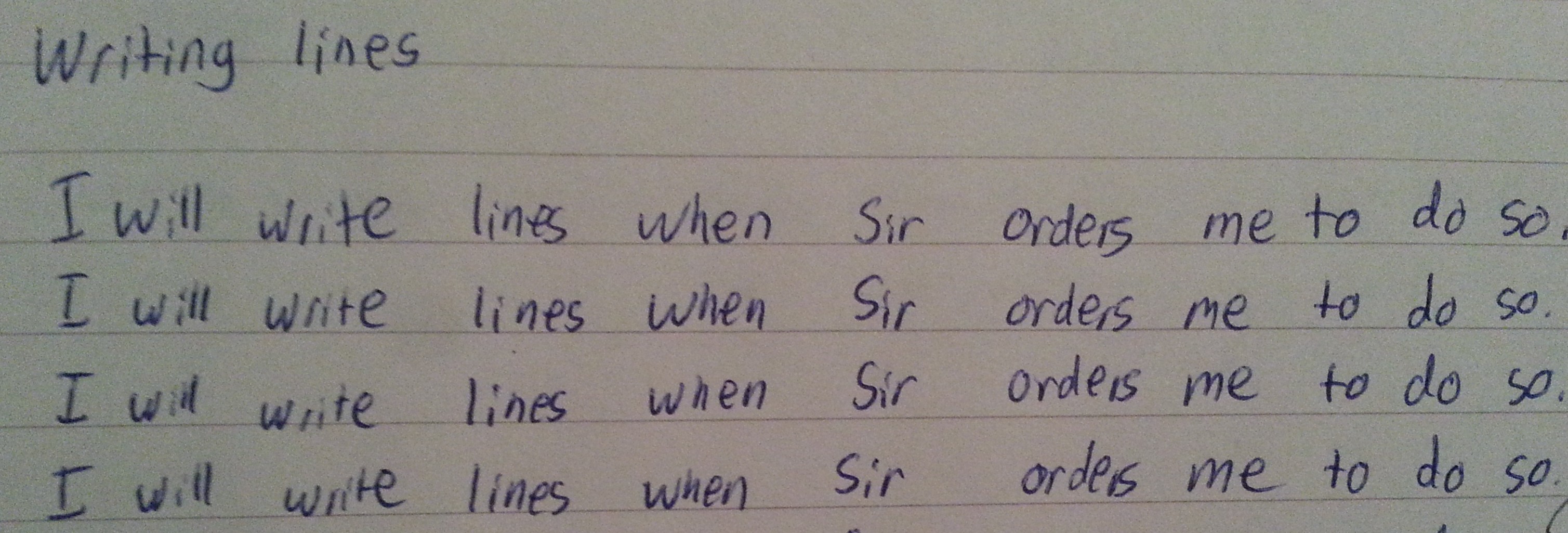 I have bee made to write lines as a (young) adult in addition to receive spankings. But doesn’t it appear that first a column of “Sir” has been written, then a column of “orders,” then a column of “me,” et al.? If so, does a girl learn her lesson this way?